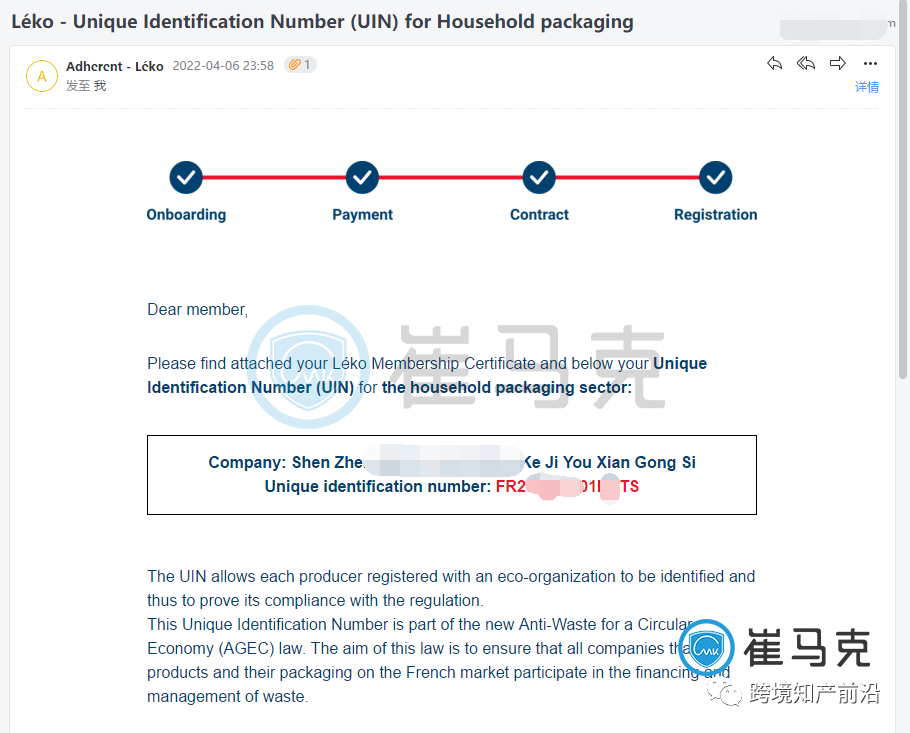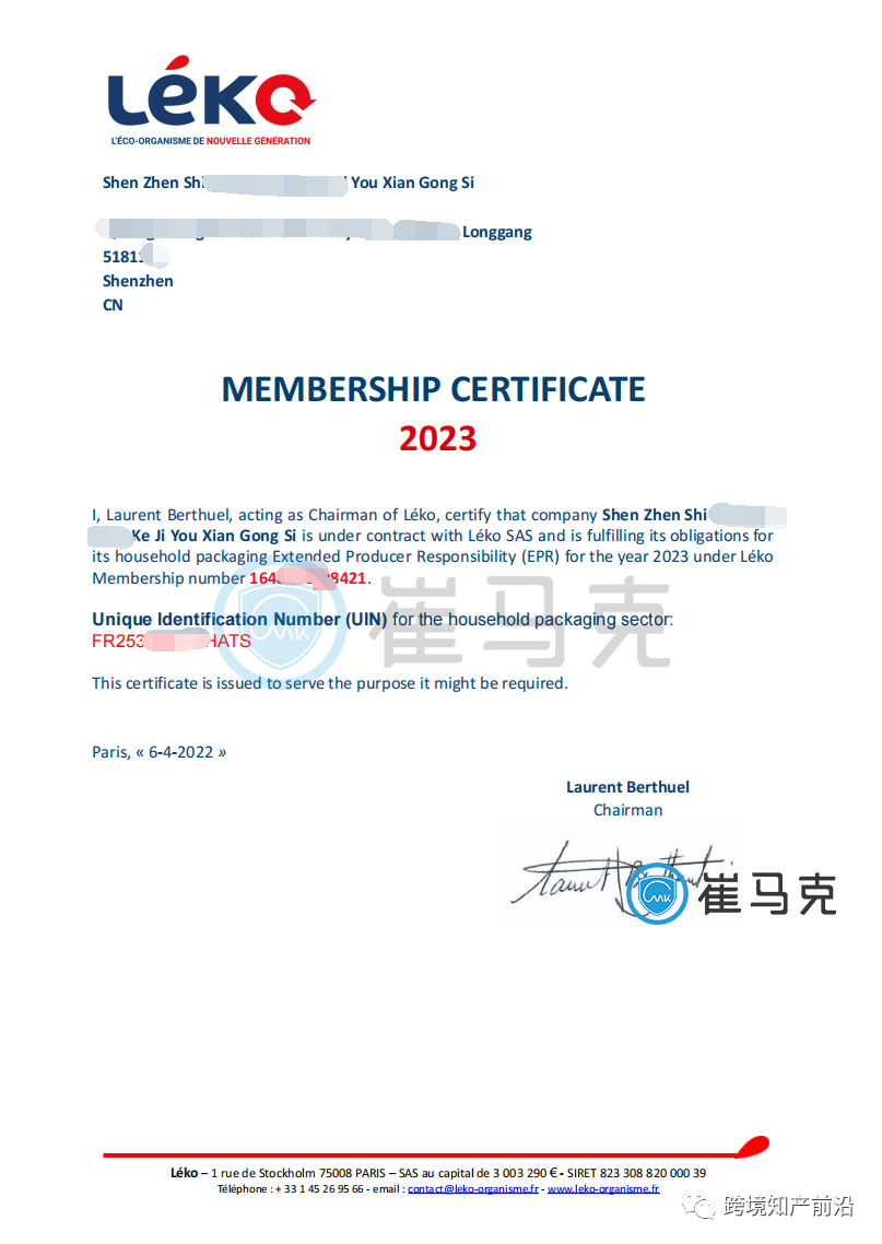 今天小崔为您分享法国包装法自助注册教程,申报教程后续推出,欢迎关注!注册成功的法国包装法UIN证书如下: